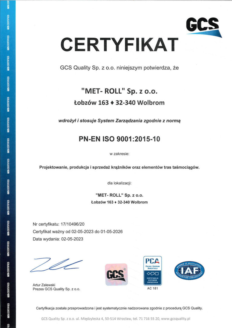 Firma Met-Roll Sp.z o.o. Łobzów 163, specjalizuje się w projektowaniu, produkcji oraz sprzedaży krążników do przenośników taśmowych oraz innych urządzeń transportowych. Głównymi odbiorcami są : kopalnie węgla, surowców mineralnych, cementownie, elektrownie, elektrociepłownie oraz inni odbiorcy stosujący transport ciągły. Miarą naszej działalności w kwestii jakości jest ocena naszych klientów. Stale rosnące wymagania rynkowe zmuszają nas do jakości bez kompromisu. Cel uzyskania najwyższej jakości wyrobów i współpraca z liderami w swoich branżach, wymusza przeprowadzanie stałych kontroli procesu produkcyjnego wg PN ISO 9001, oraz współpracę z uznanymi jednostkami certyfikującymi. Pewność, niezawodność i komfort każdego klienta, oto co nas charakteryzuje.